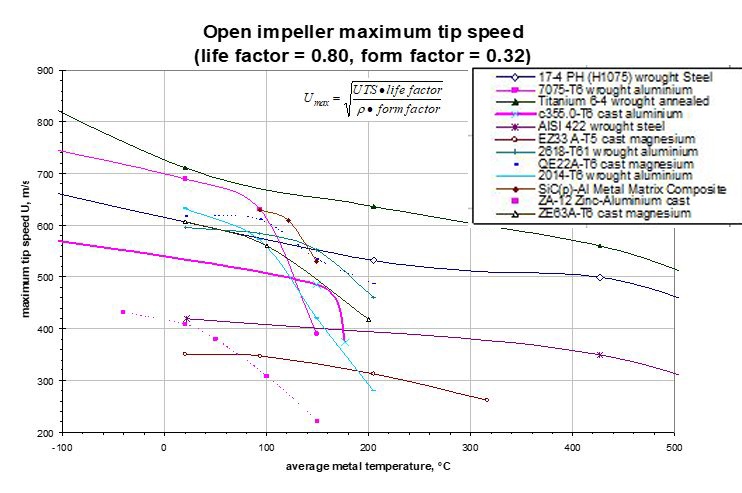 The beauty of this chart is that we can plot the tip speed against the strength, as the strength varies with temperature. It shows us why we cannot make everything out of aluminum. Aluminum is like butter when it gets hot. This chart is not very conservative, as it is based on UTS times a life factor, rather than a yield strength, and it’s based upon a boreless wheel, but it shows the differences of the materials.