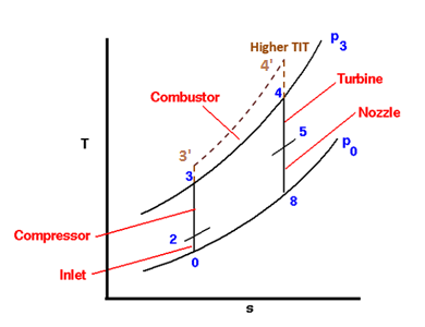 Turbine inlet temperature is one of the most critical parameters in the Brayton cycle of gas turbine engines. One way to increase the cycle efficiency is to increase the turbine inlet temperature, as illustrated in Figure 1. Here, a typical Brayton cycle T-S diagram chart visualizes the impact of higher turbine inlet temperatures on higher efficiency. Indeed, the area between the solid curves through points 0-3-4-8 represents the useful power generated by the turbine. The cycle efficiency can be calculated by dividing this area by the total area below curve 3-4, being the heat input. The dash lines convey the cycle with increased turbine inlet temperature, and the new cycle efficiency is the area in 0-3’-4’-8 curves divided by the area below curve 3’-4’. It is easy to see how a higher turbine inlet temperature increases cycle efficiency. Because of pursuing higher efficiency in modern gas turbine engine design, turbine inlet temperature has been pushed to a level that most material cannot withstand without effective cooling. Figure 2 shows the increasing trend of turbine inlet temperature since the 1940’s. Since the 1970’s, the turbine inlet temperature has been above material capability through the introduction of turbine cooling techniques.