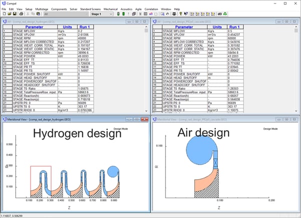 To visualize the problem, take a look at the diagram below. The design on the right is a pressure ratio 2 compressor laid out in the meanline code COMPAL™, moving basic air. The design on the left is a hydrogen design of a similar pressure ratio using the same tip speed of the impeller as the air design. Tip speed is a good proxy for maximum stress levels. So, to reach the same pressure ratio, while maintaining the same material stress limits, we need 5 stages for hydrogen, where as we only need one for air.