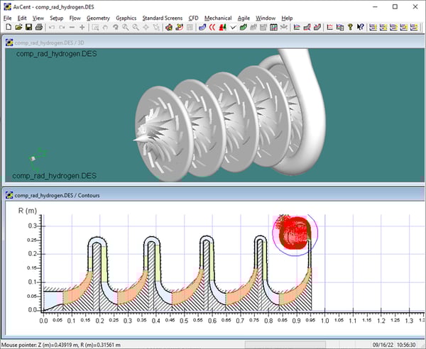 There’s nothing particularly difficult or complicated about the aerodynamic design process in this case. The same general design rules and loss models can be used for just about any fluid. Meanline codes might need a bit more scrutiny in these cases since the empirical data they’re based on tends to be weighted towards air. Otherwise, the process is very similar. The full 3D geometry, shown below in AxCent™, has a similar shaping and scale that we might expect from a more conventional air compressor.