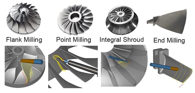 Computer-controlled 5-axis machining plays a huge role in turbomachinery component manufacturing. This is particularly true for compressor impellers, but 5-axis machining is gaining in popularity even in areas previously dominated by casting, such as pump and turbine rotors. The advent of 5-axis machining in the 1970s and 1980s sparked a revolution in manufacturing which enabled unprecedented flexibility and quality of the finished part. Three general paradigms are used today for 5-axis machining of turbomachinery: flank milling, point milling, and integral shroud milling. A fourth method, flank milling, is also used but predominantly on axial blades.