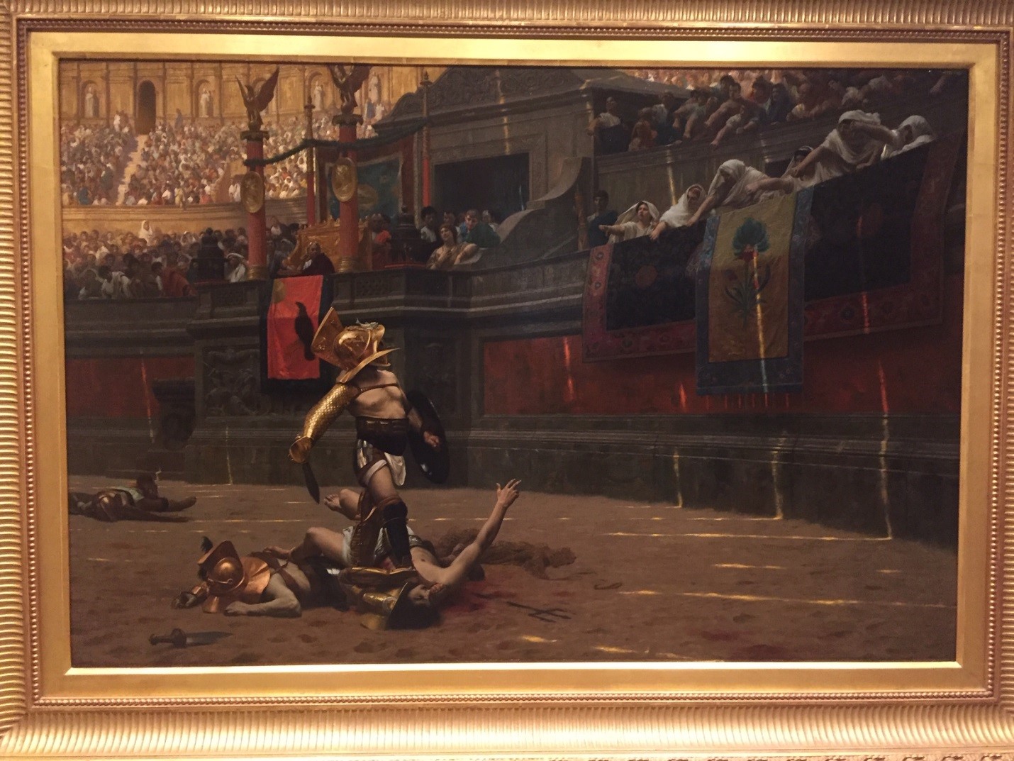 Luckily, I was able to squeeze in some sightseeing while I was in Phoenix. Given the 100⁰+ heat, I gravitated to air-conditioned venues, including the art museum. Below is the very fine painting Pollice Verso by Jean-Léon Gérôme, often referred to as Thumbs Down, although the actual translation means Turned Thumb. The painting inspired the 2000 film, Gladiator, starring Russell Crowe, and is credited with helping cement the popular belief that “thumbs down” represented disapproval from the crowd, resulting in the death of the loser. Many scholars believe that it means “swords down” to spare the loser, but facts and popular belief often disagree.