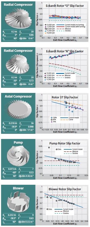 To validate the model, a variety of different impellers were studied including radial compressors, axial compressors, pumps, and blowers. The sampling of cases presented here represents the typical results achieved.