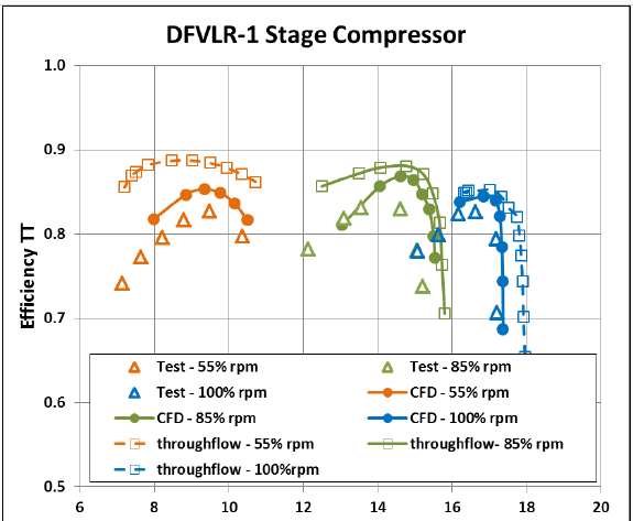 Reference [1] concluded that the throughflow solver did quite well in capturing the magnitude and characteristic losses in the stage for the DFLVR Single-Stage Axial Compressor. They also noted that the low-speed line is somewhat higher in performance relative to the test performance values.