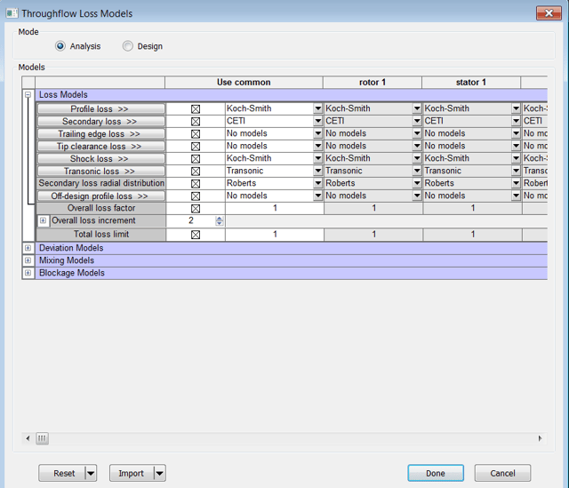 The Concepts NREC’s Agile Engineering Design System® provides access to an integrated throughflow solver (grid generation, pre-processing, post-processing, etc.) and it provides options for different loss and deviation models, Figure 1. The built-in throughflow solver also provides a set of default settings. These losses and settings can be calibrated to match actual performance data.