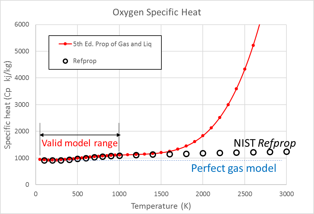 The polynomial curves are fitted to a specific range and beyond that, range is an extreme danger zone. The simple example below shows the point. In red is a plot of specific heat for oxygen, taken from a formula (similar to the one above) from the back of the text The Properties of Gases and Liquids, 5th Edition. In black is the more accurate data from a more rigorous formulation from NIST’s Refprop program.