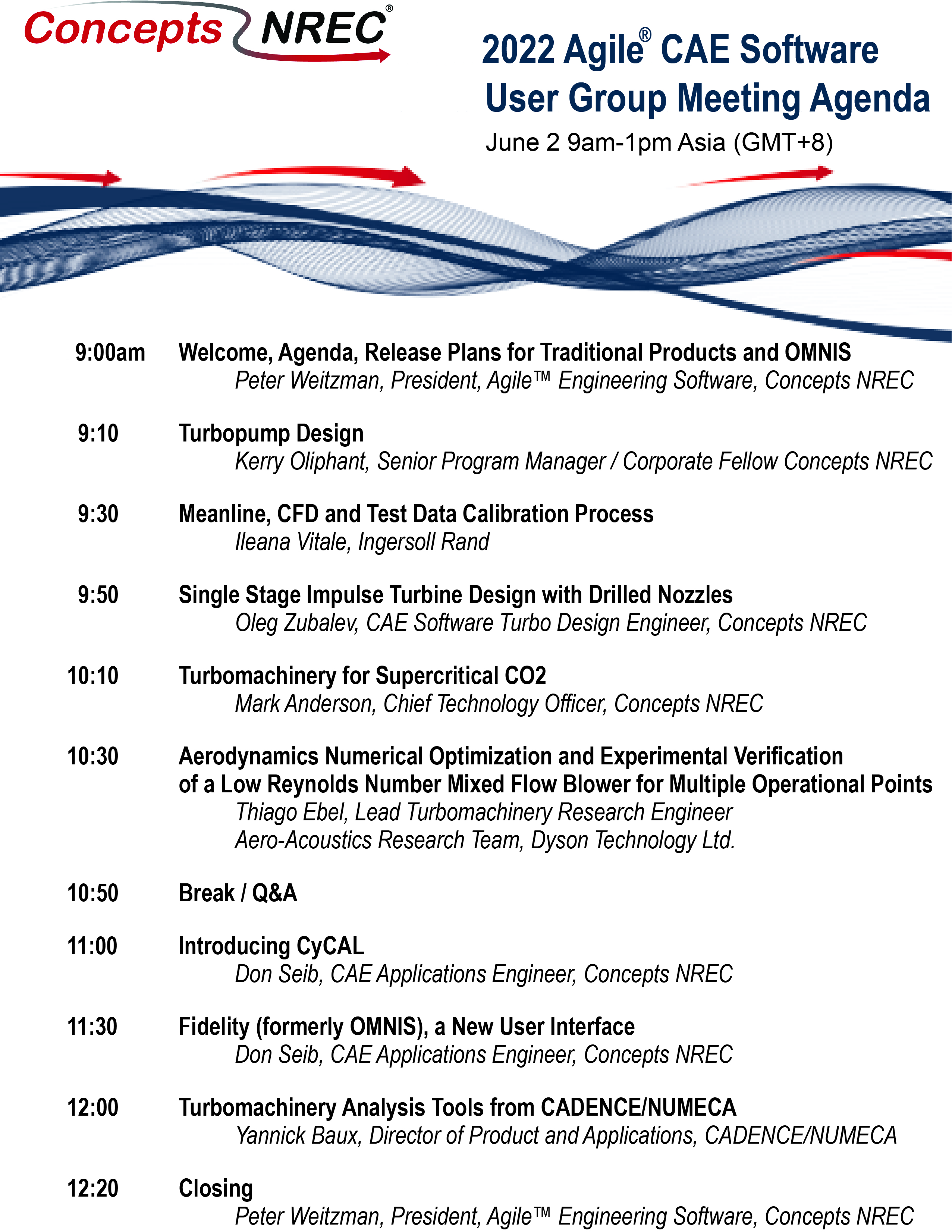 We’re excited to welcome guest speakers from Ingersoll Rand and Dyson discussing map generation using COMPAL and aerodynamics numerical optimization and experimental verification of a low Reynolds number mixed flow blower, as well as a presentation from Numeca/Cadence on turbomachinery analysis tools.