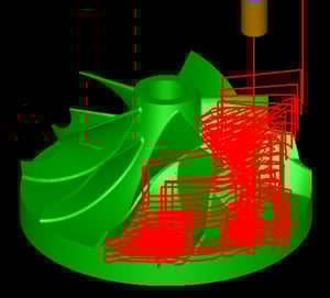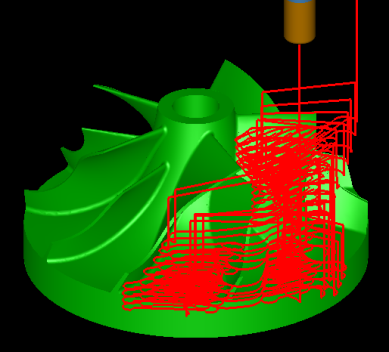 Below is a video of Concepts NREC's optional 3+2 Roughing Module that enables roughing out of impellers using 3-axis algorithms, keeping a constant tool vector. This strategy optimizes the toolpath to provide constant cutting load, making it suitable for high speed machining. This is extremely helpful for large (>0.5 m) diameter impellers and/or hard materials where roughing using the 5-axis strategies is less efficient