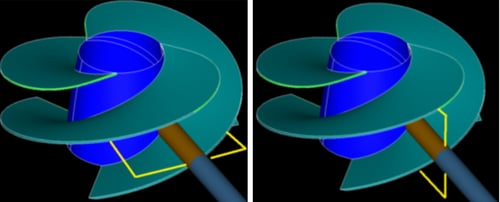 With MAX-5’s patented algorithm, dramatic cost savings can be realized using ruled-surface designs and production with a flank-milling process. Flank milling efficiently finishes the entire blade surface with one pass using the side of the cutter. Our algorithm analyzes and assesses the deviation for each blade and compensates for it to produce parts that meet very tight tolerances. The pictures below show views inside the tool to better view the reduced deviation: