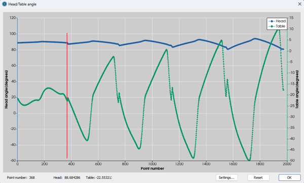 A new plotting tool has been added to the simulator to help with analyzing key process parameters including linear and rotary axes motion, drill/drag angle, surface contact angle and feedrate. The plots are synchronized with the simulation playback and offer a new way to identify and asses areas of interest. Click anywhere in the plot to jump to that point in the simulator. Visualization settings such as colors and point display can be customized. To access these plots, click the Analyze button in the Simulation window and select the parameter you would like to analyze.