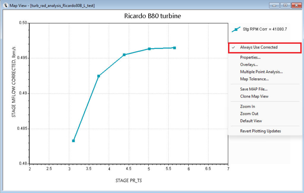 To enable the design and analysis of turbines experiencing a range of operating conditions, the Always Use Corrected option lets users view performance maps corrected to standard conditions. When selected, this persistent setting will plot mass flow and rpm corrected to a standard day for all applicable performance maps. This setting can be turned on and off at any time using the right click menu. This functionality is replicated from COMPAL 2025.1 release updates.