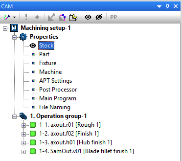 A new Properties node has been added to the Machining setup tree in the CAM window to bring more visibility to key settings. This node contains things such as Part, Fixture, APT settings, and others which are typically defined at the start of a project. Double-click on any of the items in this node to open a dialog and edit the selected settings.