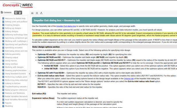 This release introduces updates for F1 help in our radial meanline programs. The content and links from dialogs will be preserved with an updated form factor. Help pages will launch in a browser window and enable the display of multiple help windows simultaneously, and improved search functionality.